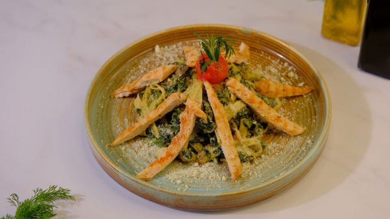Penne makarna, mantar, tavuk, kaşar peyniri, krema, özel baharatlar